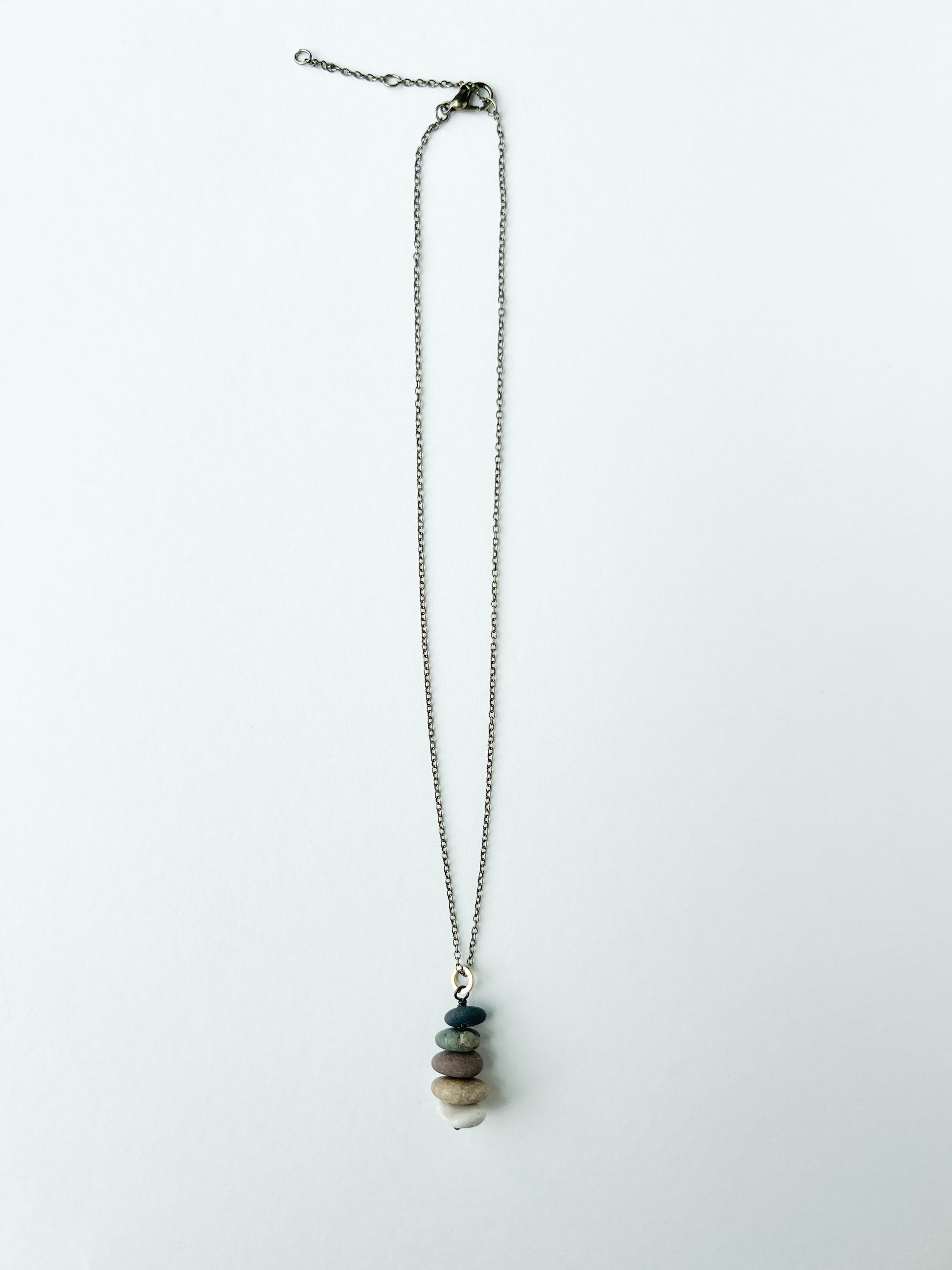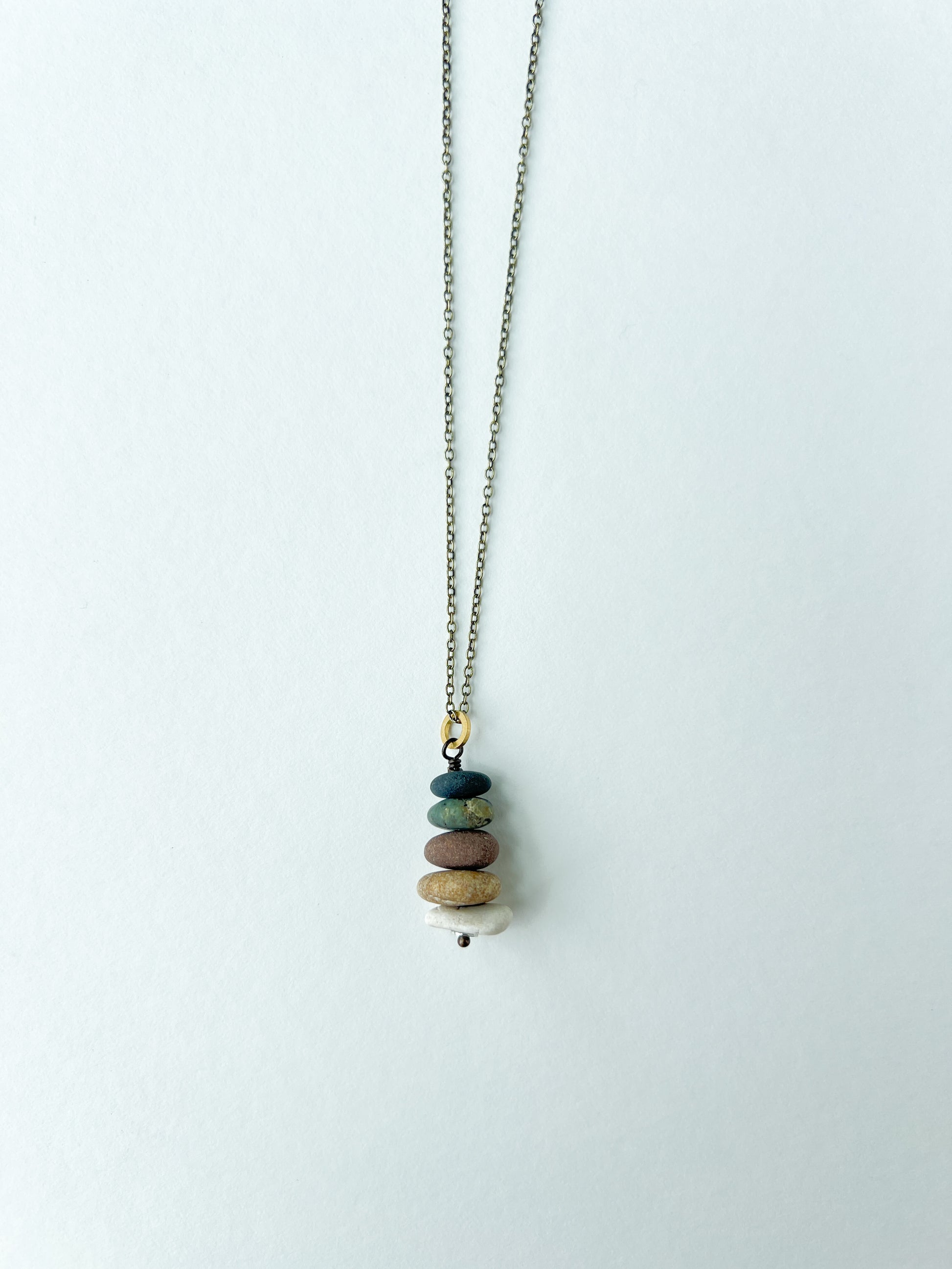Our stacked stone cairn necklaces are made with drilled Lake Michigan beach stones. The stones are hand selected, stacked and wire wrapped and each one is as completely unique as you are! Colors and sizes vary.